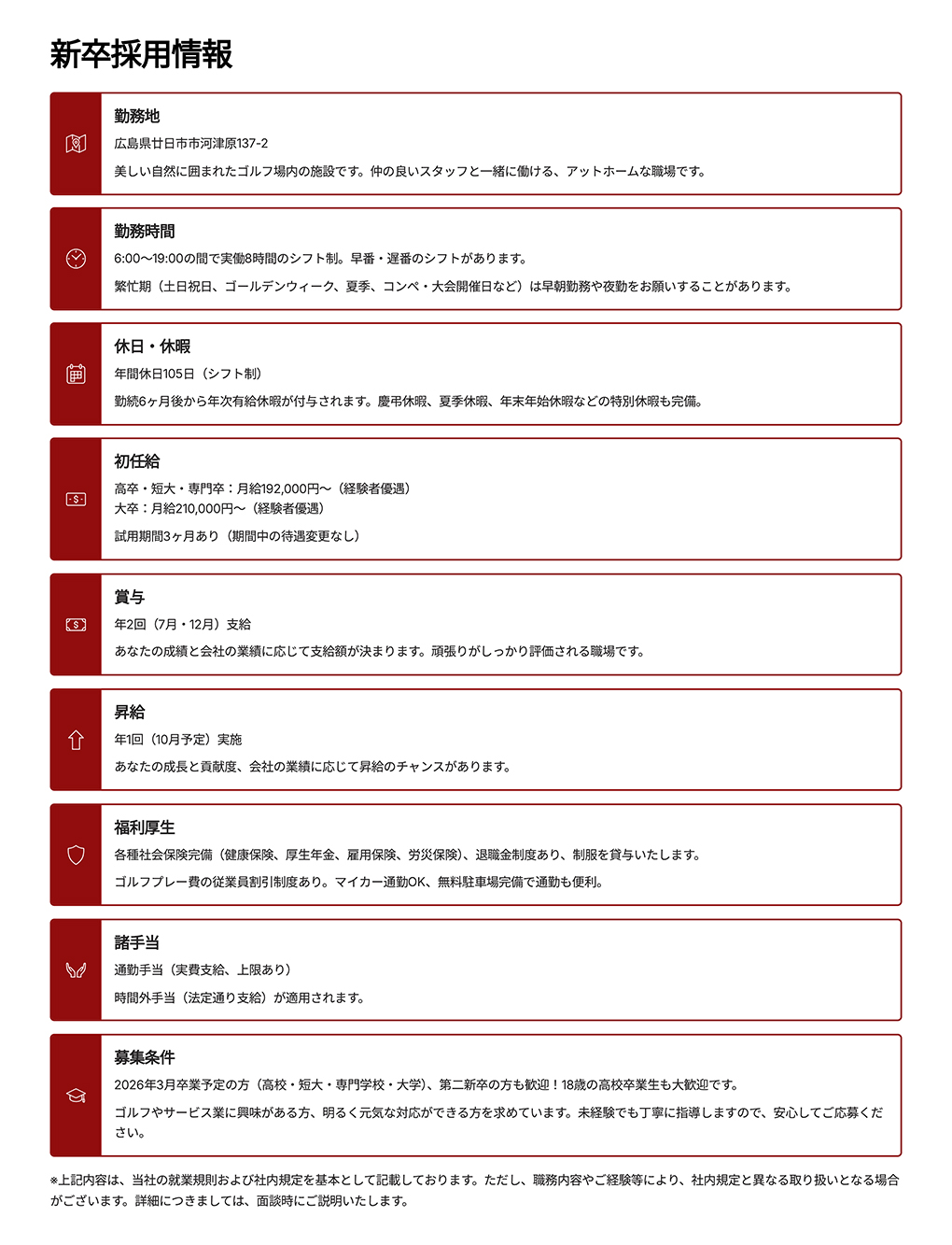 | 他 | 制服貸与・勤務日は平日限定(休日は土日祝) |