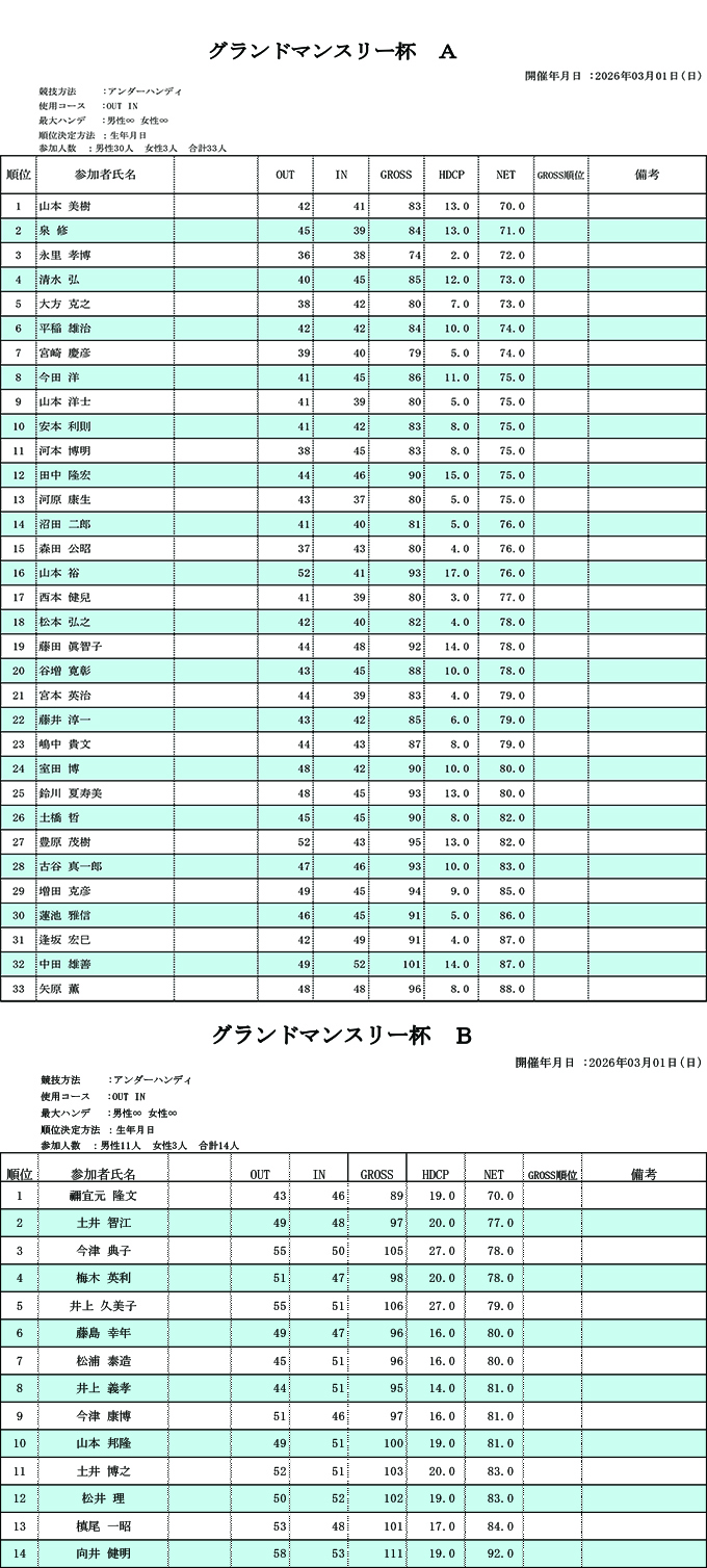 クラブ競技結果 2026年 年選択 2026年2025年2024年2023年2022年2021年 過去のクラブ競技結果はこちら 2026年2月1日 月例杯 成績表 2026/02/01 2026年1月18日 月例杯 成績表 2026/01/18 2026年1月14日 平日杯 成績表 2026/01/14